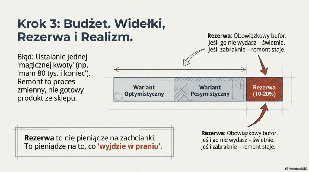 3) Budżet planuj w widełkach i z rezerwą — bo przy remoncie na styk szybko robi się nerwowo.