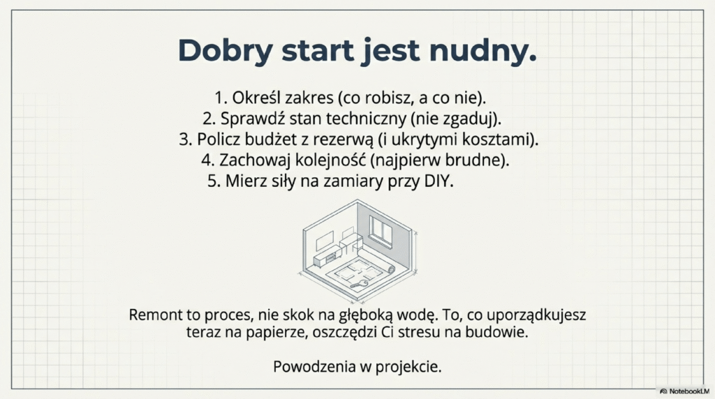 Na tym etapie nie potrzebujesz perfekcyjnego planu. Wystarczy sensowny start, który ogranicza chaos. Remont to seria kroków, nie jeden wielki skok — i to, co uporządkujesz na początku, zwykle najbardziej procentuje później.